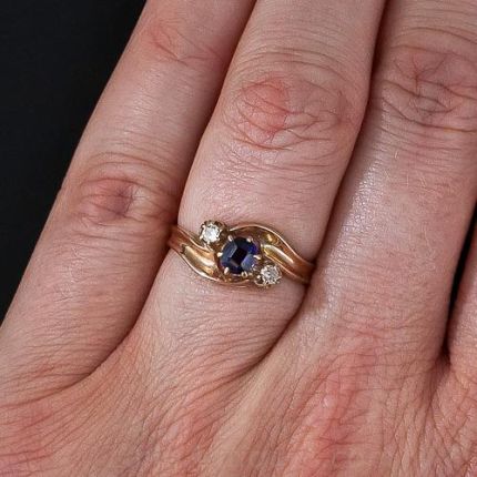 Crafted in radiant rose gold during the late-nineteenth century, this darling Victorian jewel highlights a .40 carat cushion-cut sapphire accompanied left and right by a small twinkling old mine-cut diamond. The three gemstones are set diagonally across a graceful ribbon-like bypass design with upturned edges. Sweet.