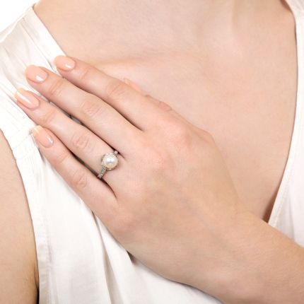 In this beautifully handcrafted ring by venerable San Francisco jeweler, Shreve & Co., a luminous domed natural saltwater pearl--one of nature's remarkable gifts--creates an elegant high profile, set in gracefully curved scallops dotted with tiny twinkling rose-cut diamonds. Shimmering single cuts adorn the top of the shoulders, while the sides are hand engraved with a classic acanthus leaf motif. Fine millegrain edging adds the final design detail. Sublime. The ring is signed and numbered, with the pearl accompanied by a Gemological Institute of America report stating: Natural Saltwater Pearl. Hand fabricated in platinum - circa 1910. Current ring size 6 1/4.