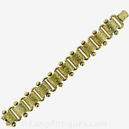 A charming Victorian silver gilt bracelet with ten hand engraved square panels with polished gold balls connected by oval links.