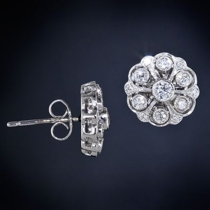 These classic and enchanting vintage-style diamond stud earrings are beautifully crafted to emulate Edwardian period originals, which are nearly impossible to find at double the price. Featuring a floral cluster of bright-white European-cut diamonds set in finely milgrained platinum and backed with 18 karat yellow gold, these wonderful and wearable earrings measure just shy of 1/2 an inch in diameter.