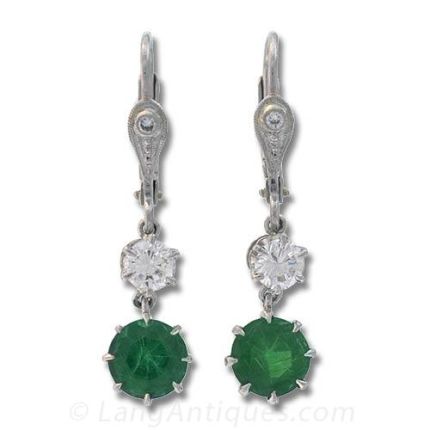 Exquisite hand crafted platinum Antique style earrings star a perfectly matched pair of vivid Zambian emeralds (1.40 carats total weight) elegantly prong set and dropped below round brilliant cut diamonds (4 total, .52 carat total weight, F-G color, VS-SI1 clarity). These earrings measure 1 long by 1/4 wide.