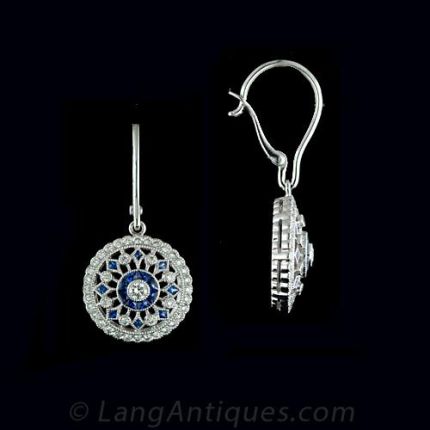 Lacy 18 karat white gold drop earrings feature calibre cut sapphires and round brilliant cut diamonds. The antique style light and airy earrings sway just below the ear.The Gemstones are described as follows:Thirty Two Calibre Cut Sapphires Weight: .40 carat total weight Eighty Two Round Brilliant Cut Diamonds Weight: .50 carat Color: G-H Clarity: VS-SI1
