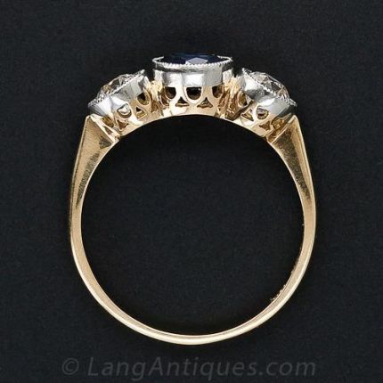 A classic Edwardian style three-stone ring, crafted in platinum over 18K yellow gold, centers on an electric blue faceted round sapphire weighing 1.25 carats. The gemstone radiates from within a finely milgrained platinum bezel and is accompanied on each side by a sparkling European-cut diamond - together weighing three-quarters of a carat. A timeless and traditional treasure, recently recreated with vintage gemstones in faithful emulation of turn-of-the-century Edwardian~late Victorian jewels.