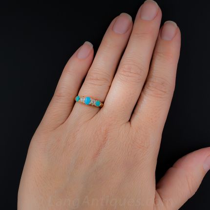 A cheerful Victorian five-stone ring, crafted in 15K rosy-yellow gold, hence of British origin, highlighting three bright blue turquoises alternating with a pair of sparkling old mine-cut diamonds. A nineteenth century sweetheart in a ring size 5 1/2.