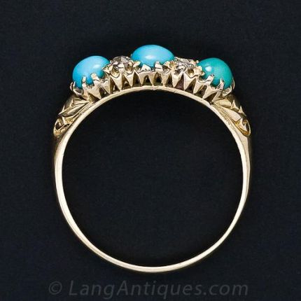 A colorful turquoise trio is accompanied by two pairs of glittering round diamonds in this classic Victorian ring. A finger size 7 1/2.
