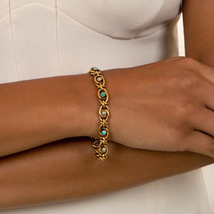 Fancy overlapping, looping links are brightened with tiny lustrous seed pearls and cheery turquoise cabochons, in this charming Victorian bracelet. Imagine it in the company of several other bracelets, making merry at your wrist. Even better--it's from France, circa 1900. Hand fabricated in 18K gold, it measures 7 1/2 inches.