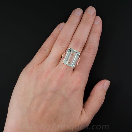 Dive into this cool and refreshing, swimming pool blue aquamarine, weighing in at 21 carats. The pretty pastel gemstone glistens between trios of round red rubies, all set in a Retro cocktail ring rendered 14K rose gold. Circa 1940s. The top measures 7/8 by 5/8 inch. Currently ring size 7 1/4.