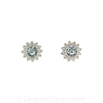 Darling antique style 18K white gold cluster earrings centered with light blue aquamarines bordered with rays of diamonds.The Gemstones are described as follows:Two AquamarinesWeight: .90 carat total weightTwenty Four Round Brilliant Cut DiamondsWeight: .15 carat total weightColor: H-IClarity: VS-SI