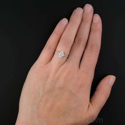 Few original Art Deco delicacies come as fine and fabulous as this sparkling white gem. A gorgeous old-cut marquise diamond, weighing 1.04 carats, accompanied by a GIA Diamond Grading Report stating: G color - VVS1 clarity, is presented to perfection in an artfully designed and appointed mounting hand-fabricated in platinum - circa 1920s-30s. The glorious diamond radiates between gently tapered rows of seamlessly-set French-cut diamonds leading to a fluted ring shank. An elegant scrolled gallery and delicate milgraining add the finishing flourishes to this exceptional Jazz Age jewel. Magnifique! Currently ring size 6.