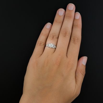 A sizzling icy-white European-cut diamond, weighing 1.16 carats and accompanied by a GIA Diamond Grading Report stating: G color - SI1 clarity, scintillates between elegantly styled shoulders composed of pairs of small sparkling marquise diamond flames followed by a baguette and round diamond. A truly stunning and distinctive Art Deco dazzler - circa 1920s-30s. Currently ring size 6 1/2.