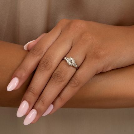 You're about to begin a new chapter, creating your own history as a couple. What could be more fitting than a dazzling and exquisitely crafted antique ring that has endured the test of time to symbolize this new beginning? Finely hand fabricated in exceeding durable and lustrous platinum, the ring dazzles with a radiant 1.63 carat European-cut diamond, aided in sparkle east and west by gently curved arcs set with a trio of baguettes and one single-cut diamond. A new history in the making. Total diamond weight, 1.87 carats. GIA Diamond Grading Report states: L color - SI2 clarity. Currently ring size 5 1/2.