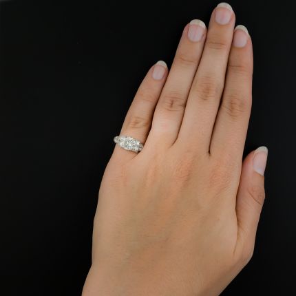 Although you may not have loved geometry in high school, this sensational Art Deco diamond ring might just change your mind about the subject. An icy-white, ultra-sparkling, gorgeous transitional round brilliant-cut diamond, weighing 1.63 carats, is splendidly accented on each side by bright and shining European-cut diamonds set in rectangular, square and, yes, pentagon-shaped settings. The striking architectural outline of the gallery is characteristic of classic Deco design. Center stone accompanied by a GIA Diamond Grading Report stating: H color - VVS2 clarity. Total diamond weight, 2.38 carats. Hand fabricated in platinum, circa 1920s--1930s. Currently ring size 5 1/4.