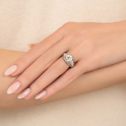 Works of art are often presented on elegantly designed pedestals that best display their beauty. And this is often true with one of nature's extraordinary works of art--the diamond. In this case, a supremely scintillating 1.69 carat European-cut diamond is displayed atop an exquisite mounting, pierced to create sweeping scrolls and geometric shapes, all frosted with glittering single and European-cut diamonds. Perfectly positioned at eye level for your viewing pleasure. Total diamond weight, 2.27 carats. Hand fabricated in platinum. Currently ring size 5 1/4. Digital GIA Grading Report available stating: I color - VS1 clarity.