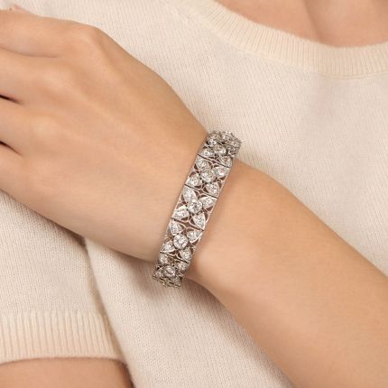 Bracelets are like beautiful borders for you hands--the brighter the better--and this dazzling Jazz Age jewel offers sparkle to spare. Gently graduated, its fifteen exquisitely fashioned openwork links are aglitter, gloriously so, with lively bright white European-cut diamonds (total weight 11.50 carats) set in flower-like designs. Delicately applied milgrain edging throughout and a graceful hand-engraved scroll decoration on the sides add the final delightful details. Marvelous! Hand fabricated in platinum circa 1920s-30s, it measures 7 1/4 inches.