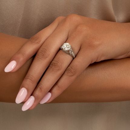This ring blends the beauty of Art Deco architecture with masterful jewelry design, creating a small monument to the era. Radiant, with just the slightest hint of color, a 2.42 carat European-cut diamond is elevated by a high gallery intricately pierced to create distinctive shapes, set with glittering diamonds and rising to create graceful stem-like double claw prongs. Openwork diamond-set shoulders and a fully-engraved shank add the exquisite finishing details to this extraordinary jewel. Total diamond weight, 2.72 carats. Hand fabricated in platinum, it is currently ring size 6. GIA Diamond Grading Report states: K color - I1 clarity.