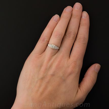 Consummate Art Deco geometry is in full flower in this original Jazz Age jewel, die-struck and hand-finished in bright 18K white gold, circa 1920s-30s. Diamond studded steps lead up to a bright white and sparkling quarter-carat European-cut diamond displayed in a decoratively milgrained chamfered center setting. Signed Keepsake, currently ring size 6.