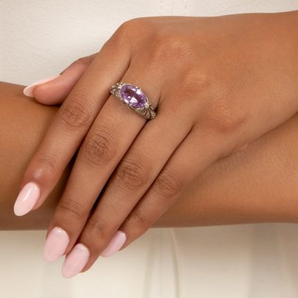 An enchanting gemstone—an elegantly elongated, faceted oval sapphire, weighing 3.73 carats and imbued with a gorgeous (natural, no-heat) lilac-pink hue, is set east to west atop a sensational, highly distinctive, original Art Deco mounting. Hand fabricated in platinum (circa the 1920s-30s), it is elegantly designed with a diamond-set, bow and fan motif on the shoulders and calibre synthetic* sapphire horseshoes on the side gallery. A singularly stunning and striking jewel. Total diamond weight - .40 carat, total sapphire weight (including synthetic stones) - 3.93 carats. Currently ring size 8 3/4. Accompanied by a GIA Gemological Report stating: Natural. No Indications of Heating. *Original to the piece and period, synthetic sapphires were used for the flawless clarity and color consistency.