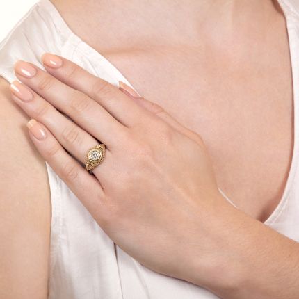 In this light and lovely Art Deco ring, a crisp, bright .39-carat transitional round brilliant cut diamond sparkles solo atop a dome of lacey filigree, intricately rendered in a pretty floral motif. Sweet. Die-struck in 18K yellow gold, currently ring size 7.