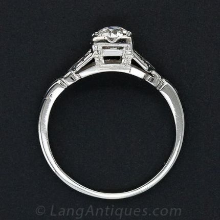 In this divine 1930s engagement ring, a dazzling illusion-set .45 carat European-cut diamond is held aloft by cupid's arrows, emblazoned with orange blossoms, symbol of enduring love. Hand-fabricated in gleaming 18 karat gold, this chic and stylish ring will stack beautifully with a wedding band. In a finger size 6 1/2.