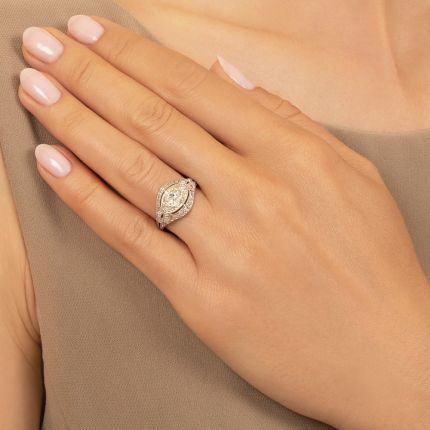 A sizzling icy white European-cut diamond, weighing .63 carat, keeps eternal watch from the center of this ultra-cool eye-shaped sparkler, expertly hand fabricated in platinum, dating back to the peak of the Art Deco period - circa 1925. The scintillating stone, accompanied by a digital GIA Diamond Grading Report stating: G color - SI1 clarity, beams brilliantly from within a raised navette-shaped center section embellished with glittering single-cut diamonds. Decorative piercing and millegraining add the finishing flourishes to this resplendent Jazz Age jewel. Currently ring size 5 1/2.