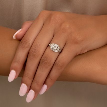 A bright white and shining, high-quality European-cut diamond, weighing .65 carat, scintillates front and center in this classic Art Deco engagement ring, hand fabricated in platinum, circa the 1920s-30s. The gently domed navette-shaped crown twinkles all around the center stone with 16 tiny single-cut diamonds, bringing the total diamond weight of the Jazz Age jewel to .90 carat. Currently ring size 6 1/2. Condition note: two small diamonds have chips.