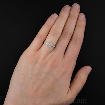 This sleekly streamlined original Art Deco sparkler, hand-fabricated in platinum, circa 1930, stars a bright white European-cut diamond weighing .68 carat. The scintillating stone shines front and center between diamond-set epaulets followed by pairs of slender straight baguettes punctuated with arrowheads, leading to a soft knife-edge ring shank. Chic, sophisticated and stunning. Currently ring size 6 1/2.