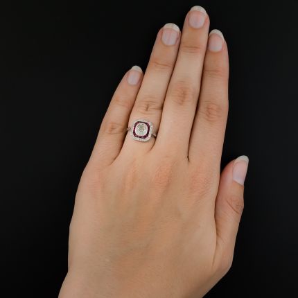 This radiant rarity--an Art Deco engagement ring, hand fabricated in platinum, circa 1920s--dramatically presents a beautiful bright and shining antique oval diamond (weighing .86 carat) surrounded by double octagonal frames (or halos) of calibre rubies and tiny antique cushion-cut diamonds, finished with a scalloped side gallery and pointed diamond-set shoulders. A resplendent and distinctive low-profile finger-hugger. Currently ring size 6 1/2.