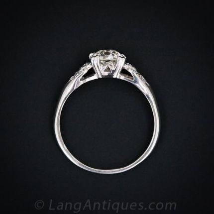 This delightful estate platinum and diamond engagement ring from the 1930s shows off a scintillating old-European cut diamond weighing just 12 points shy of a carat. It is elegantly presented in a graceful setting with a sizzling flame of diamonds on each shoulder. Classic!