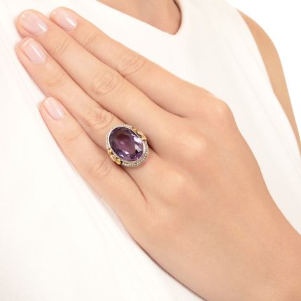 Art Deco jewelry offers something for everyone, from diamond-encrusted bracelets to lacy filigree pendants to gorgeous, juicy gemstone rings like this one. With the hue of purple watercolor paint, the glorious 10.25 carat oval amethyst that glistens atop this fun and festive ring is encircled by a shimmering halo of natural pearls, accented east and west by rosy-yellow gold bow-like elements. Exceptionally fine, intricately worked hand engraving around the gallery and down the shank adds beautifully textured detail. Perfect—for you! Hand fabricated in 18K white gold and 14K rosy-yellow gold, it is currently ring size 6 3/4.