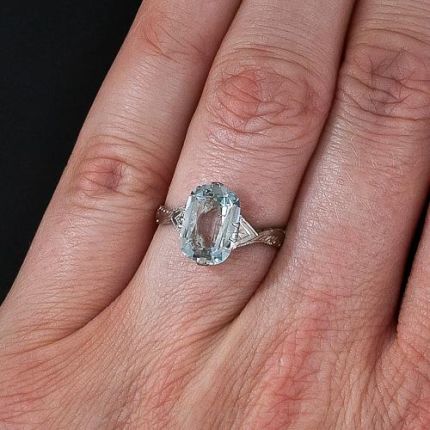 A relatively petite faceted oval aquamarine, with a refreshing light pastel-blue hue, glistens solo atop a modest but very lovely mounting, handcrafted in gleaming 14 karat white gold with a slight twist (on its shoulders). Circa 1930s.