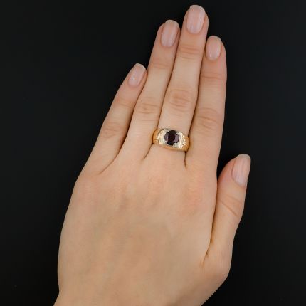 A dusky red faceted round Arizona Garnet, weighing 1.60 carats, glistens and glows from within a stately Art Deco Gent's ring crafted in gleaming 14K yellow gold with a white gold top setting. Circa 1930s-40s. Currently ring size 7.
