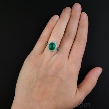 A luscious cabochon emerald, weighing 7.60 carats. This delicate beauty glows with a bright richly saturated vibrant green from within a sparkling halo composed of small bright white round diamonds in this chic and stunning original Art Deco ring, superbly hand- fabricated in platinum, circa 1920s-30s. The gorgeous centerpiece is enhanced and supported by artfully sculpted shoulders, each adorned with a row of calibre emeralds bordered by tiny twinklers. Fine hand-engraved details add the finishing flourish to this jubilant Jazz Age jewel. 5/8 inch, currently ring size 6 and cannot be sized.