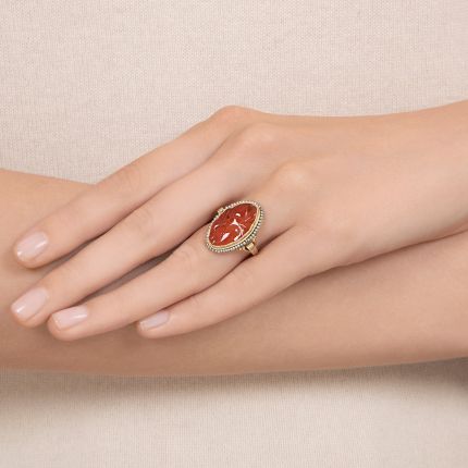 In this darling Depression-era (circa 1930) finger-hugger, a translucent rich amber-orange oval carnelian, hand carved with a traditional Chinese melon motif, is framed all around by a strand of tiny seed pearls and supported by fluted 18K yellow gold shoulders and ring shank. Hand fabricated, currently ring size 6 1/4.