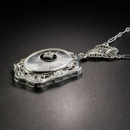 A radiant, diamond-pierced frosted rock quartz crystal plaque, accented with black onyx, is fancifully framed and suspends from a matching loop and an original 18" chain in this delightful Depression-era adornment, die-struck and hand finished in 14K white gold, circa 1930. 1 13/16 by 11/16 inches.
