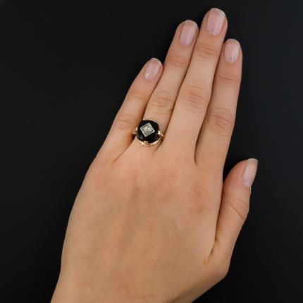 For a dramatic effect, there's nothing like the color black. In this Art Deco era ring, a shimmering old mine-cut diamond, set in platinum, is accentuated by a smooth and gleaming cushion-shaped black onyx plaque and is strikingly juxtaposed with a brightly burnished 10K yellow gold ornamental setting. Currently ring size, 7 3/4.