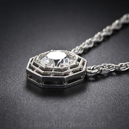 A sparkling 1930s vintage platinum and diamond necklace anchored by a bright-white and beautiful .70 carat European-cut diamond presented in a triple-tiered, finely milgrained octagonal setting. The 18-inch rope neckchain is enlivened by a pair of small arrowhead-set diamonds, plus an extra 'hidden' diamond near the clasp. A very wearable and versatile necklace perfect for everyday and/or special occasions.