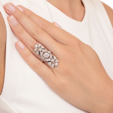 Just what you've always wanted, a shield for your finger. And a fabulous Art Deco one, at that. Measuring just over 1 1/2 inches long and shining throughout with a mix of round diamonds, this ring of extravagant length and sparkle is exquisitely pierced and designed with a diamond-shaped center embellished north and south by fan-like elements. A .82-carat European dazzles in the middle, while dashes of deep blue synthetic* calibre sapphires add striking accents. A stunning finger guard, indeed. Total diamond weight - 2.35 carats, total synthetic sapphire weight - .40 carat. Hand fabricated in platinum, it is currently ring size 5 1/4. Condition note: Two small diamonds are chipped. The center diamond has two small nicks. *Original to the piece and the period, synthetic sapphires were used for their flawless clarity and color consistency.