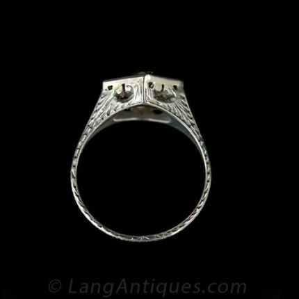 This original Deco diamond ring dates back to the 1930s. A 1/3 carat European cut diamond is set in an 18k white gold, hand engraved setting and is framed by a hexagonal arrangement of synthetic, French cut (or scissor cut) sapphires original to the piece. The diamond is described as follows:One Old European-cut DiamondWeight: 0.33 caratColor: JClarity: SI1