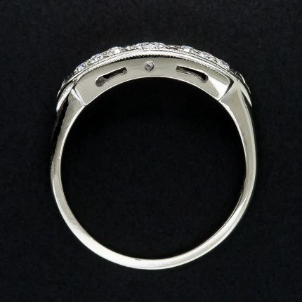 A sleek and low-profile, 1930s vintage band ring featuring a bright-white and lively European-cut diamond, weighing .18 carats, floating in the center. The diamond is framed in an open hexagonal design, and enhanced on each side by a shimmering double row of single-cut diamonds that terminate in raised chevron shoulders. Beautifully hand-fabricated in sturdy 14 karat white gold, in a finger size 6 3/4.