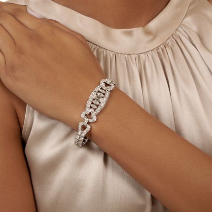 We imagine that when a flapper wanted to sparkle in a speakeasy, she might have worn something like this—a dazzling diamond bracelet that lit up her wrist and the dance floor. Hand fabricated in platinum, it features a distinctively shaped focal piece, centered by a .80 carat baguette, embraced by pairs of marquise diamonds, and surrounded by a glittering frame of European and transitional round brilliant-cut diamonds. The luminous assemblage connects to double rows of diamonds in square settings, creating an all-eyes-on-you jewel that is always ready for a party. Total diamond weight, 5.55 carats. Measures 7 inches. Clasp tongue is 14K white gold.