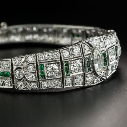 Centering on a European-cut marquise diamond, this quintessential Art Deco bracelet, hand fabricated in platinum, sparkles mightily throughout with 5.00 carats total of bright-white European-cut diamonds effectively accented with green calibre stones (two are emeralds, the others glass or synthetic spinel*). A gorgeous vintage treasure. *During the 1920s-30s, due to their color consistency and flawless clarity, synthetic colored stones--and sometimes colored glass--were considered an improvement over their natural counterparts; the subtle differences are only detectable with a microscope. 7 1/4 by 5/8 inch.