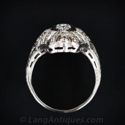 This exemplary diamond dinner ring from the early Art Deco period - late teens early 1920s - also exhibits Edwardian design influences from the decades just before. However, putting academics aside, this is a truly beautiful just-for-fun ring and versatile enough to be worn for cocktails as well as dinner! Crafted in sturdy platinum and a mix of European-cut and single-cut diamonds. Superb!