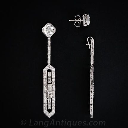 These sexy straightline diamond drop earrings drop almost 3 inches down the ear. Two large European cut diamonds totaling 3.20 carats are set in octagonal box heads and can be worn simply as diamond studs alone or can be worn with the dramatic long line of diamonds dropped below. A mix of baguettes and European cut diamonds add an intriguing flair.