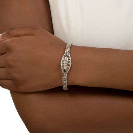 Fanciful filigree abounds throughout this light and lovely Depression-era wrist bauble, centered by a curvaceous focal piece twinkling with a trio of tiny single-cut diamonds, embraced by emerald *glass darts. A dainty Art Deco delight, it is crafted in 12K white gold and measures 6 1/4 inches.*Back in the day, circa 1920s-30s, due to their uniformity of color and flawless clarity, synthetic (or glass) stones were considered an improvement over their natural counterparts, besides the fact that the virtually undetectable differences are only discernible with a microscope and gemological expertise.