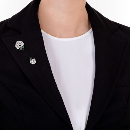 The beauty of a jabot pin is that only the decorative ends are seen, allowing the fabric to show in between, and the ends on this elegant Art Deco version are small works of art. Masterfully hand fabricated in platinum, an exquisite pierced design is set with an array of glittering diamonds, the larger top end accented by an elongated hexagonal (or double-bullet) shaped stone and the smaller end by a bullet-shaped diamond. A stepped composition of black onyx and green jadeite cabochons add a dash of fabulous color. Whether you pin this intriguing jewel on your jean jacket or on your favorite party dress, the effect is utterly striking--be ready to talk about it. Circa 1925, probably French. Total diamond weight, 2.04 carats. In platinum, it measures 1 1/2 inches long.