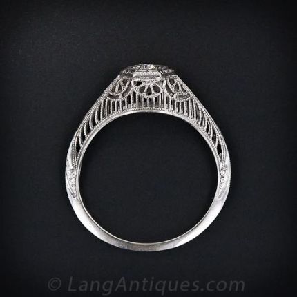 This ring is a petite feat of engineering. It features a scintillating .10 carat old European cut diamond set flush within a hexagon head. It is mounted atop a flawless vertically pierced gallery which is highlighted by a fan motif. The shoulders display the fine craftsmanship with all of the pierced wire work coming together perfectly.