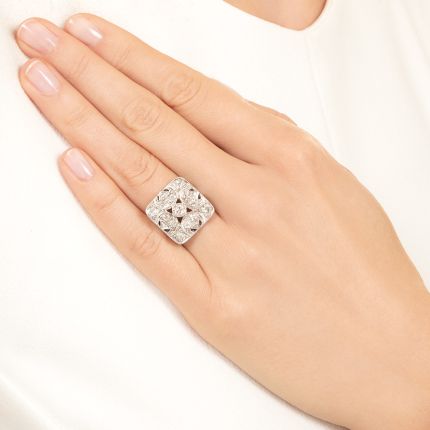 No matter your math aptitude, Art Deco makes geometry fun. This cool ring features a square, soft-shouldered top centered by a circle set with a round brilliant-cut diamond, surrounded by an array of diamond-set shapes. The shimmering quadrilateral tops a sleek shank that allows it to sit perfectly perpendicularly to your finger. Fun, right? Total diamond weight, 1.15 carats. Hand fabricated in platinum (top plate) and 14K white gold (shank and underside), circa 1920s-30s. It is currently ring size.