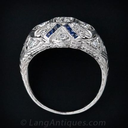 This darling, original platinum Art Deco diamond ring works both as an engagement ring or as a just-for-fun ring. The three main diamonds on top are accented with a double 'V' of calibre synthetic sapphires and a sprinkling of twinkling single-cut diamonds. Circa 1925.