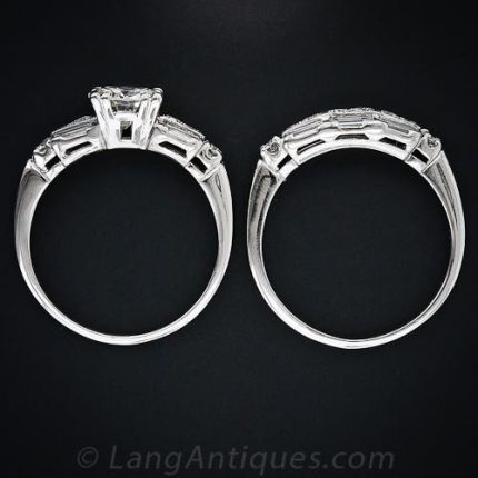 Original Art Deco wedding sets don't come around very often, and this one's a sensation. A bright and brilliant 1.09 carat transitional-cut diamond glistens between 'V' shape diamond shoulders, each composed of two slender baguettes and three small round diamonds. This design is beautifully emulated in the matching diamond wedding band to a stunning effect. A splashy yet sophisticated look with maximum sparkle!