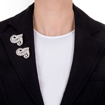 A double, mirror-image cornucopia artfully sculpted crafted in platinum and packed to the hilt with an array of bright white and sparkling European-cut diamonds with a smattering of gleaming baguettes. The flowing multidimensional design is equally effective when separated into double clips or nestled back-to-back to form a glittering and glamorous brooch. Dynamic Art Deco, 10.00 carats total weight. Circa 1930. 2 3/4 inches by 1 3/8 inches.